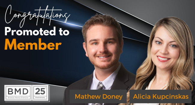 Brennan, Manna & Diamond (BMD), a multi-regional business law firm, celebrates the promotion of two attorneys to Member. As BMD reflects on its strong 25-year history, these promotions reaffirm the firm’s entrepreneurial spirit for continued growth and success over the next 25 years.